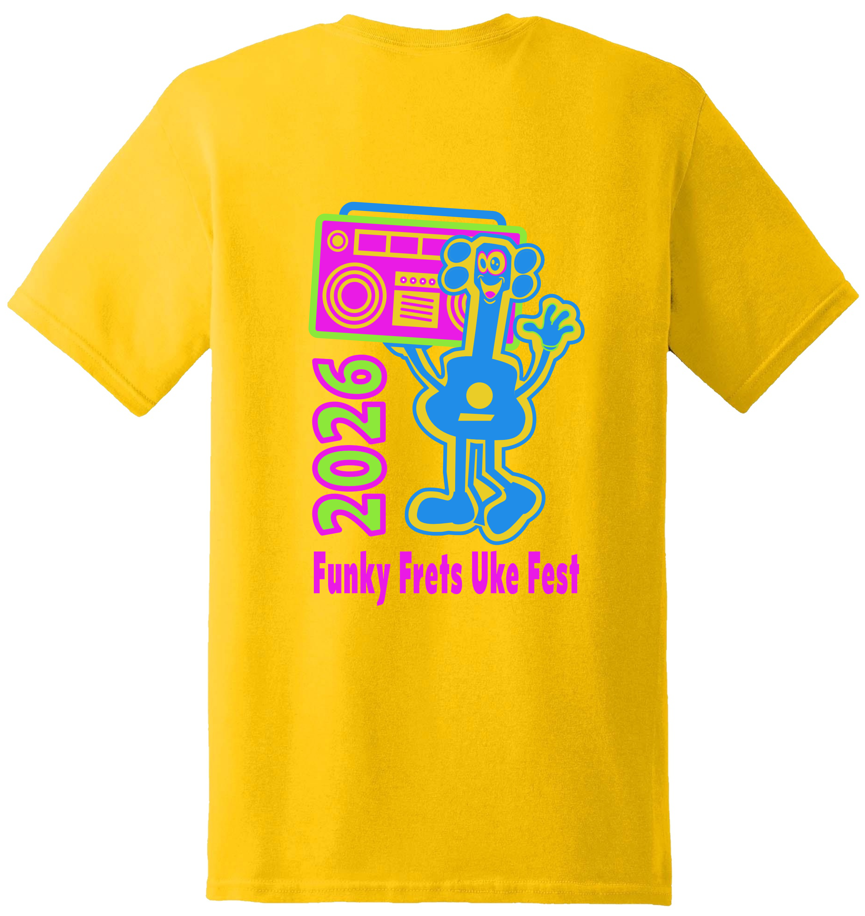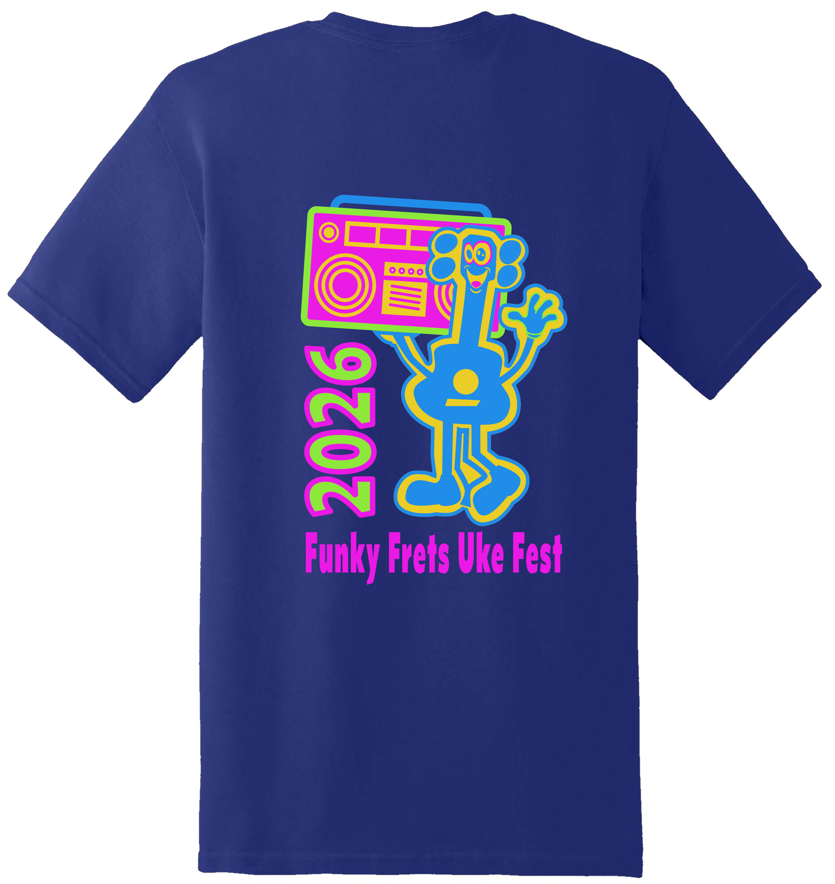 These are the 2026 Funky Frets Uke Fest t-shirts. Available in short-sleeve and long-sleeve versions.